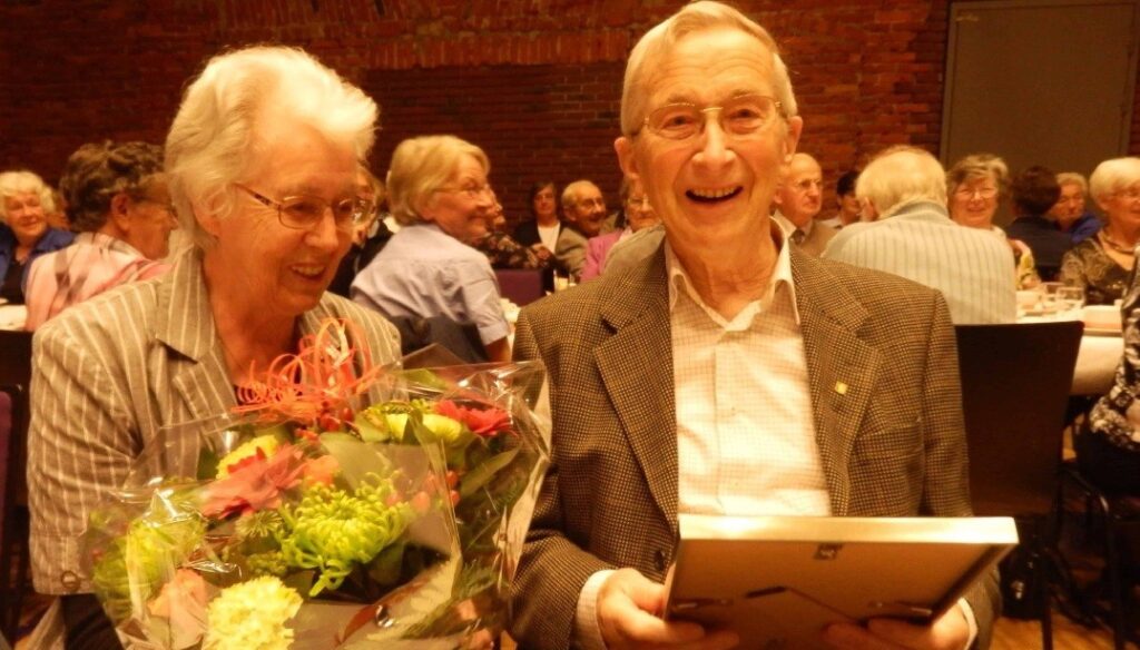 | ENORME INZET Middelpunt van de avond was echter Jan de Vet, lid van het eerste uur, die in de afgelopen 35 jaar met zijn enorme inzet en zijn uitgebreide kennis van de lokale geschiedenis, van grote betekenis voor de heemkring is geweest. Hij ontwikkelde zich tot ‘het gezicht’ van de heemkring en een vraagbaak voor iedereen. de heer en mevrouw de Vet |