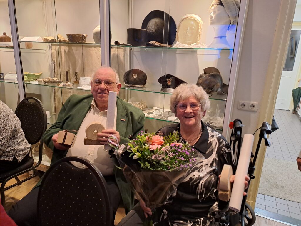 Anny en Frans van Loon zijn jarenlang vrijwilliger geweest bij onze vereniging. Ze hebben een aantal jaren deel uitgemaakt van de tentoonstellingscommissie en ook hebben zijn een groot aantal jaren de maandelijkse nieuwsbrief bezorgd bij de leden. Ook kwartaalblad De Mulder werd door hen bij een aantal leden in Rijen bezorgd. Als blijk van waardering ontvingen zij het Molensteentje met oorkonde. Bep Ghijsens en Stan van Beijsterveldt stopten ook als vrijwilliger. Door persoonlijke omstandigheden konden zij helaas niet aanwezig zijn. Het Molensteentje wordt bezorgd.