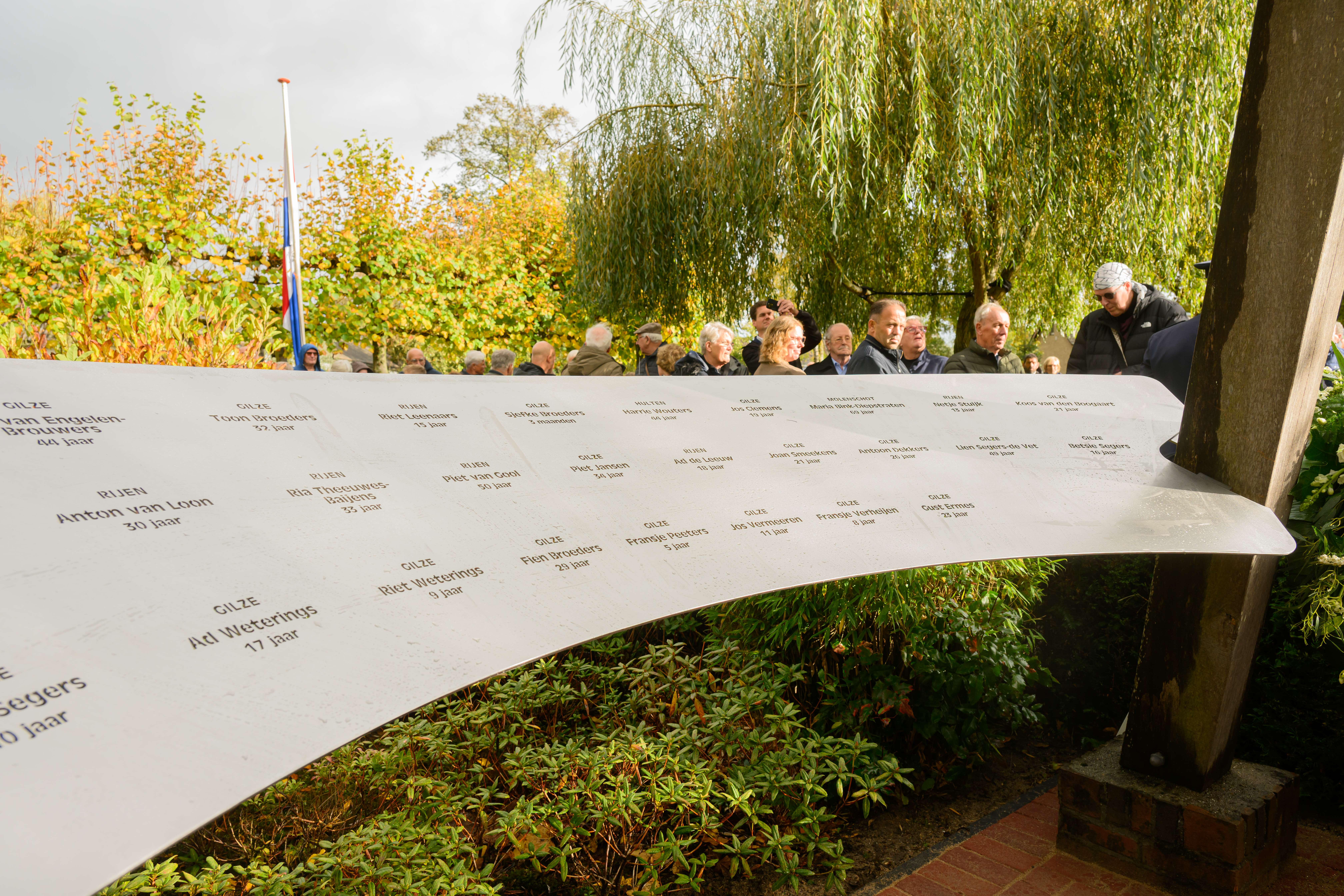 Onder grote belangstelling heeft burgemeester Derk Alssema samen met vier nabestaanden het nieuwe oorlogsmonument onthuld op het kerkhof in Gilze. Dat gebeurde op de 27e oktober, de dag dat in 1944 de bevrijding van Gilze en Rijen begon. Het monument, een ontwerp van Carla van den Ouweland, brengt voor het eerst de 88 namen van alle oorlogsslachtoffers uit Gilze, Rijen, Hulten en Molenschot samen. Op initiatief van en in samenwerking met de heemkring heeft de gemeente dit gedenkteken mogelijk gemaakt.