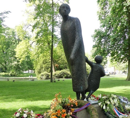 Het monument ‘De Vlucht’ in Breda is een bronzen beeld van een moederfiguur die de stad verlaat en een kind aan de hand meeneemt, dat naar de stad omkijkt.
